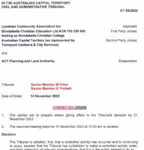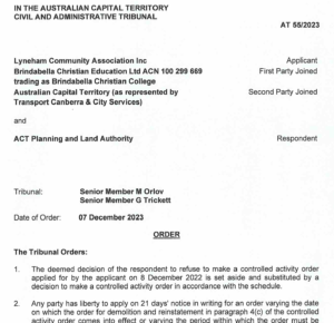 - 8 December 2023: ACAT orders Brindabella Christian College to close car park, rip it up
